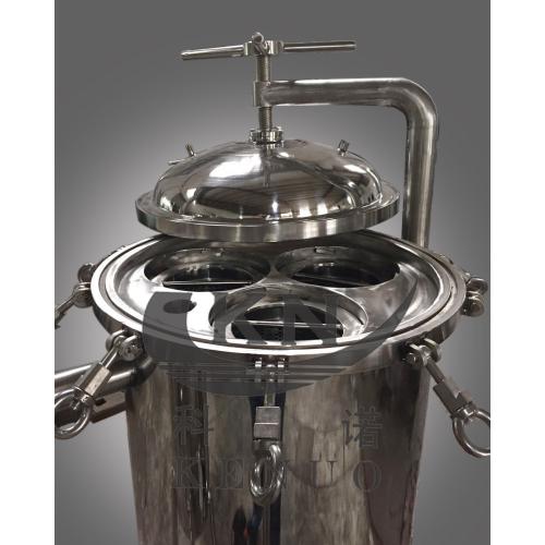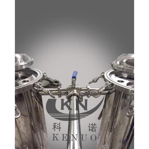 并联袋式过滤器是由二个圆柱体组成,内、外表面抛光,顶部装有压力表、排气阀,管道接头采用胀合连接,经1.0MPa水压试验,三通外螺纹旋塞启闭灵活,该设备结构紧凑,操作方便,维修简单。适用于除去鲜奶、糖液、饮料、口服液等液体中各种肉眼看不见的固体杂质的净化。两只过滤器交替使用,可在不停机的情况下更换过滤袋,适于长期连续生产。