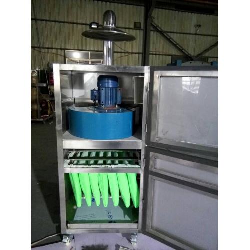 移动式除尘器,不锈钢捕尘器工作原理是含尘气体由风机通过吸尘管吸入箱体,进入滤袋过滤,粉尘颗粒被滤袋阻留在表面,经过过滤的净化气体由出风口排出,可直接排放在室内循环使用,也可根据需要排出室外。整个除尘过滤是一个重力,惯性力,碰撞,静电吸附,筛滤等综合效应的结果。除尘器连续工作一段时间后,滤袋表面的粉尘不断增加,继而进行清灰,粉尘抖落在集尘器(抽屉)中,再由人工进行处理。