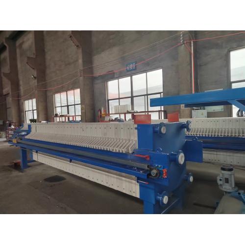 3、液压压紧:液压压紧机构的组成由液压站、油缸、活塞、活塞杆以及活塞杆与压紧板连接的哈夫兰卡片。液压站的结构组成有:电机、油泵、溢流阀(调节压力)换向阀、压力表、油路、油箱。液压压紧机械压紧时,由液压站供高压油,油缸与活塞构成的元件腔充满油液,当压力大于压紧板运行的摩擦阻力时,压紧板缓慢地压紧滤板,当压紧力达到溢流阀设定的压力值(由压力表指针显示)时,滤板、滤框(板框式)或滤板(厢式)被压紧,溢流阀开始卸荷,这时,切断电机电源,压紧动作完成,退回时,换向阀换向,压力油进入油缸的有杆腔,当油压能克服压紧板的摩擦阻力时,压紧板开始退回。液压压紧为自动保压时,压紧力是由电接点压力表控制的,将压力表的上限指针和下限指针设定在工艺要求的数值,当压紧力达到压力表的上限时,电源切断,油泵停止供电,由于油路系统可能产生的内漏和外漏造成压紧力下降,当降到压力表下限指针时,电源接通,油泵开始供油,压力达到上限时,电源切断,油泵停止供油,这样循环以达到过滤物料的过程中保证压紧力的效果