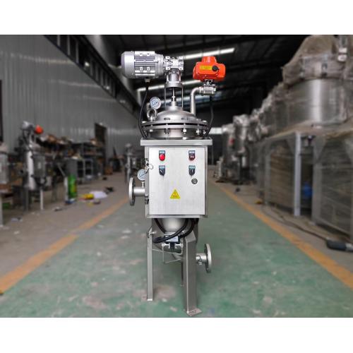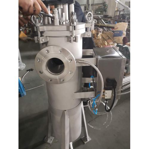 待处理的水由入水口进入机体,水中的杂质沉积在不锈钢滤网上,由此产生压差通过压差开关检测进出口压差变化达到设定值时,智能配电系统给控制阀门、电力马达信号,引发下列动作:电机带动刷子旋转,对滤芯进行清洗,压差降至设定值时,电机停止运转,系统恢复初始状态,这样的清洗过程连续重复 N 次,过滤器不锈钢滤芯内的杂质以及颗粒物≥50%时,进水口阀门自动关闭,蒸汽或空气阀门自动打开,电动刷子转动直至过滤器内的水完全排空,过滤器底部的排泥阀自动打开,讯庆过滤器经多次反洗被截留在滤芯内的污物或者颗粒物由排泥口排出;整个循环过程(需根据带过滤的水中的杂质和颗粒物自行设置);控制系统采用 PLC 机电一体化控制(全自动、半自动、手动);控制模式为压差模式控制或者时间模式控制;为确保生产过程中停水;整个过滤设备设有旁通管道;作为应急通道;