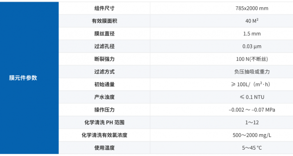 浸没式超滤膜组没有外壳对污染物容纳能力强,装填密度较MBR组件高,设计水量大,占地面积小,出水品质高,使用寿命长,具有广泛的应用领域,如地表水/海水、再生水和市政/工业废水处理领域,其大大简化预处理工艺,减少占地面积,抗来水冲击负荷能力强,确保了高品质出水水质,增加整个系统水利用率。