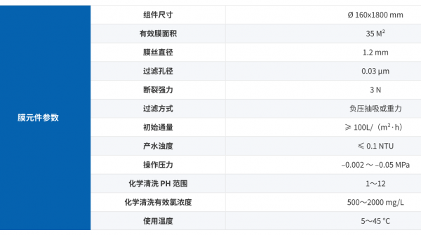 浸没式超滤膜组没有外壳对污染物容纳能力强,装填密度较MBR组件高,设计水量大,占地面积小,出水品质高,使用寿命长,具有广泛的应用领域,如地表水/海水、再生水和市政/工业废水处理领域,其大大简化预处理工艺,减少占地面积,抗来水冲击负荷能力强,确保了高品质出水水质,增加整个系统水利用率。